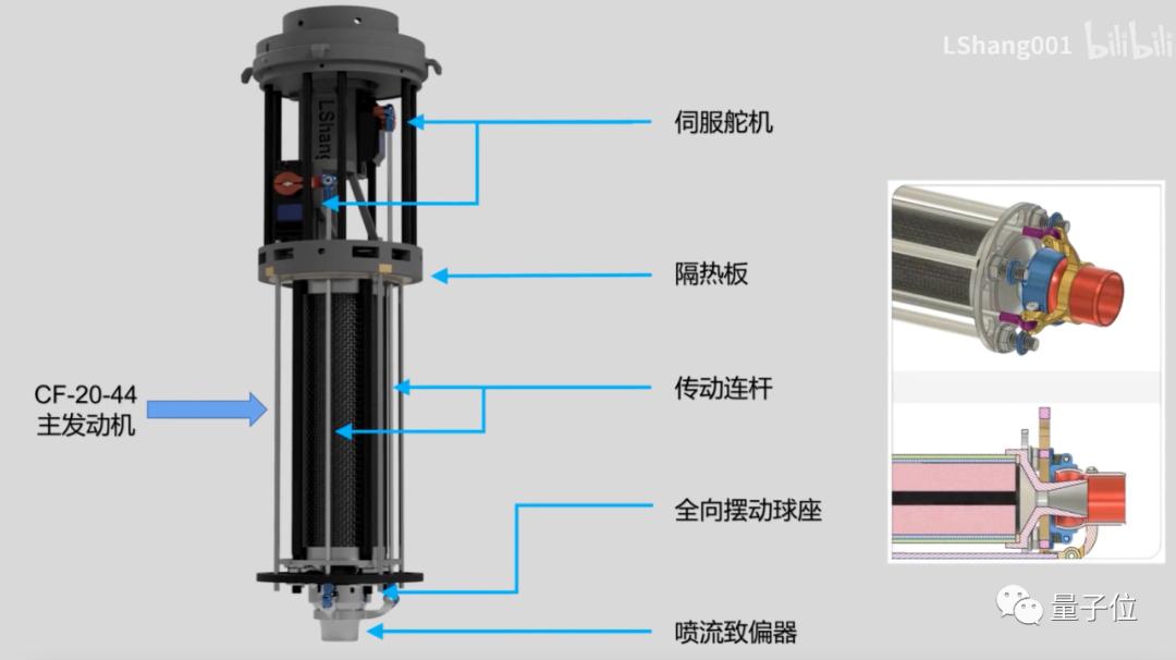 火箭的主发动机采用CF-20-44,其最大推力偏向角15°,能够全向摆动,不控制时无推力损失: