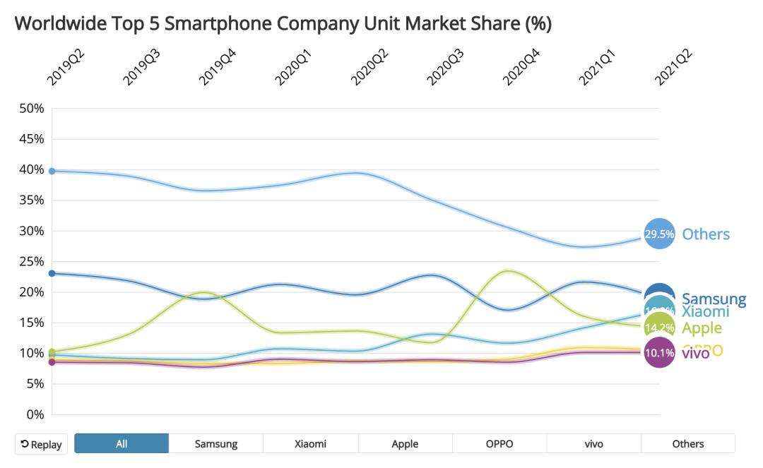2019Q2至2021Q2期间,全球智能手机市场市占比图源:IDC