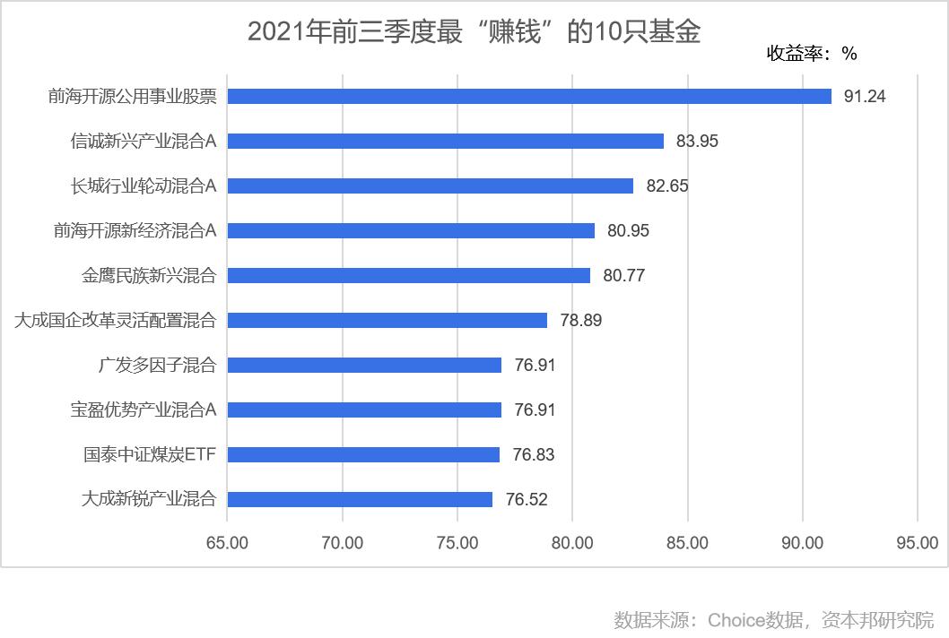 对于权益类基金受到投资者青睐的原因,或与近年来其优秀的赚钱效应有关。Choice数据显示,截至三季度末,市场最赚钱的10只基金均为权益基。