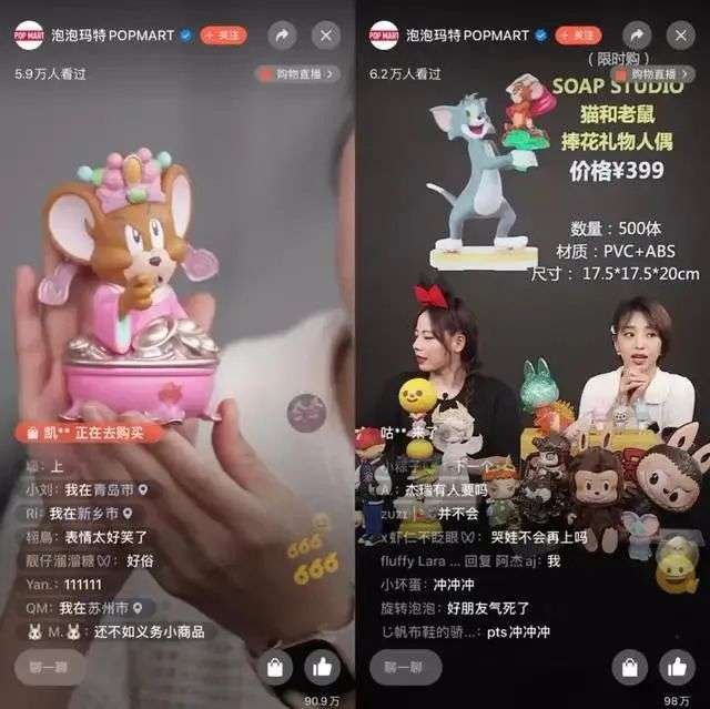 但对于潮玩,刷曝光式套路并不那么奏效。与快消品不同,潮玩转化需要建立在IP认知或者设计认同之上,产品的强娱乐和情感属性,让叫卖式直播的消费刺激不足。另外,线上渠道也缺少了即时快乐感和氛围感。