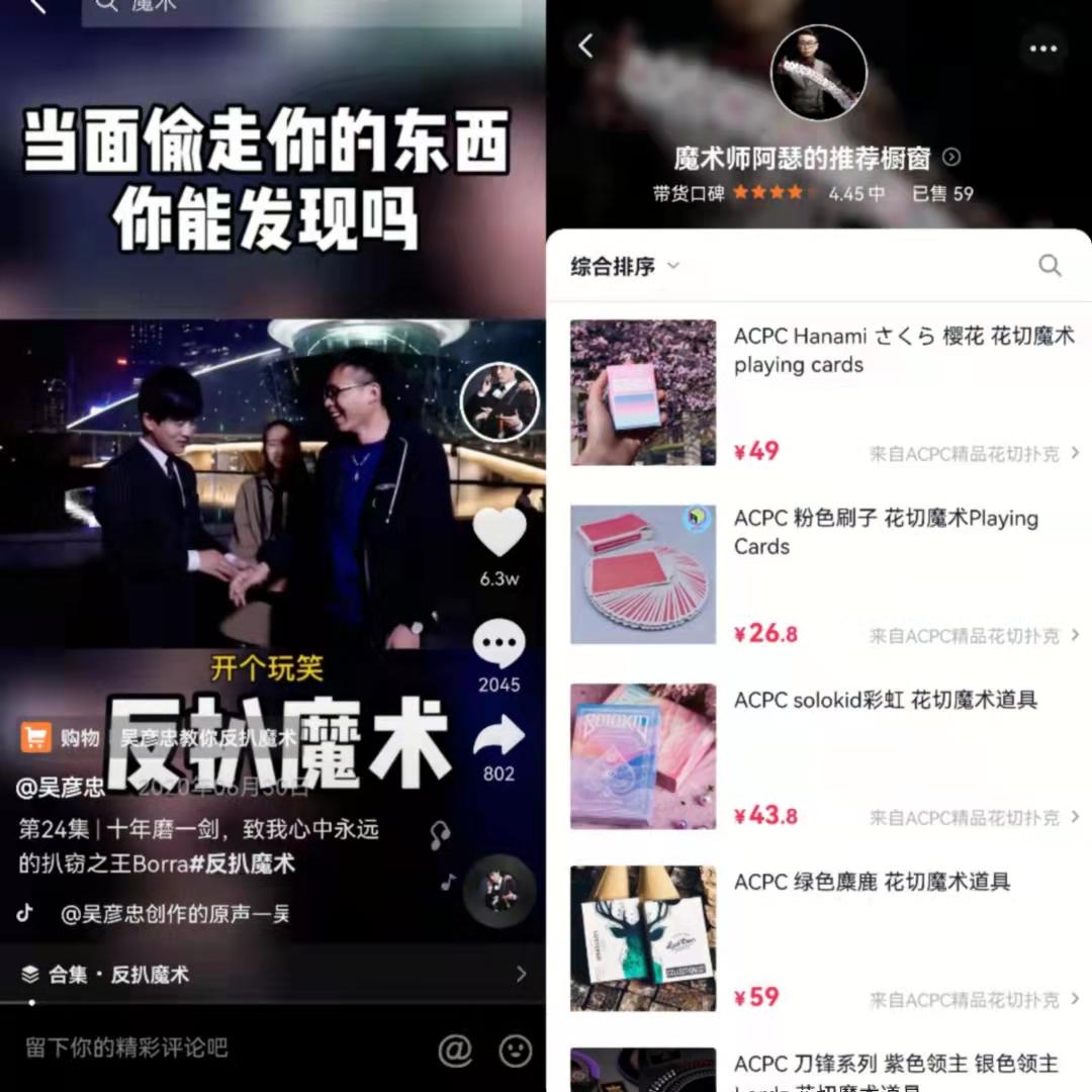 在账号主页的商品橱窗内, 魔术师通常会推荐售卖魔术道具、书籍、自制课程和生活百货。在相关魔术视频中挂上小黄车已是普遍做法,但销量并不高,一个原因是非职业魔术师很少会买专业道具来练习。