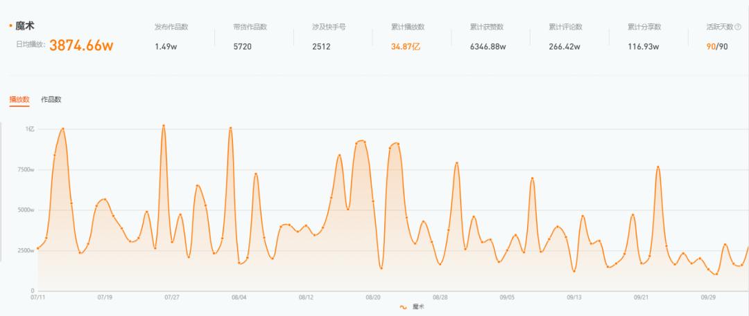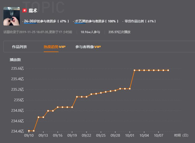 据新抖显示,账号标签包含魔术的有186个账号,其中有18个达到百万粉;“魔术”话题累计有235亿次播放。快手近90天内的“魔术”声量同样活跃,总播放数超34亿。