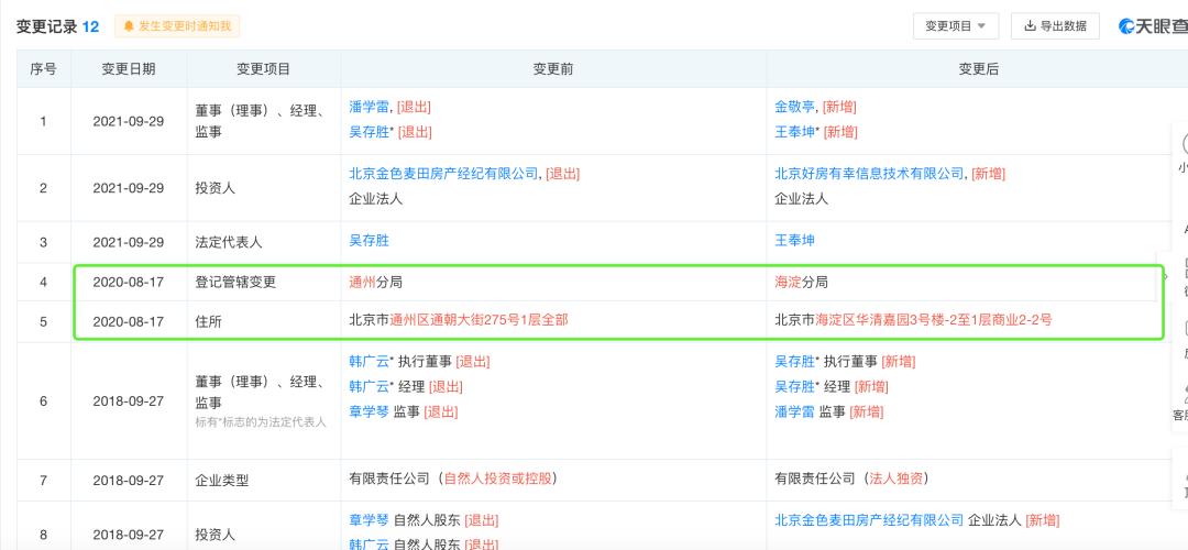 天眼查App显示,10月4日,“北京福旺房地产经纪有限公司”发生工商变更,新增字节跳动关联公司“北京好房有幸信息技术有限公司”为股东,持股比例100%。原股东“北京金色麦田房产经纪有限公司”退出,同时法定代表人由吴存胜变更为王奉坤。