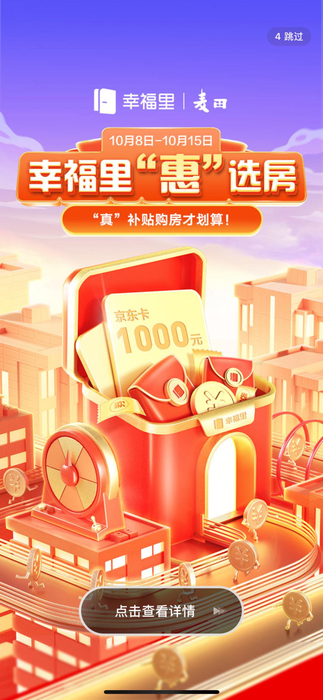 目前用户打开幸福里APP的开屏弹窗上,幸福里、麦田的名字也处于“联名”状态,联合推出“幸福里惠选房”活动,为用户推荐二手房房源,如果45天内通过麦田经纪人成交,购房者可得到200-1000元面值不等的京东卡。