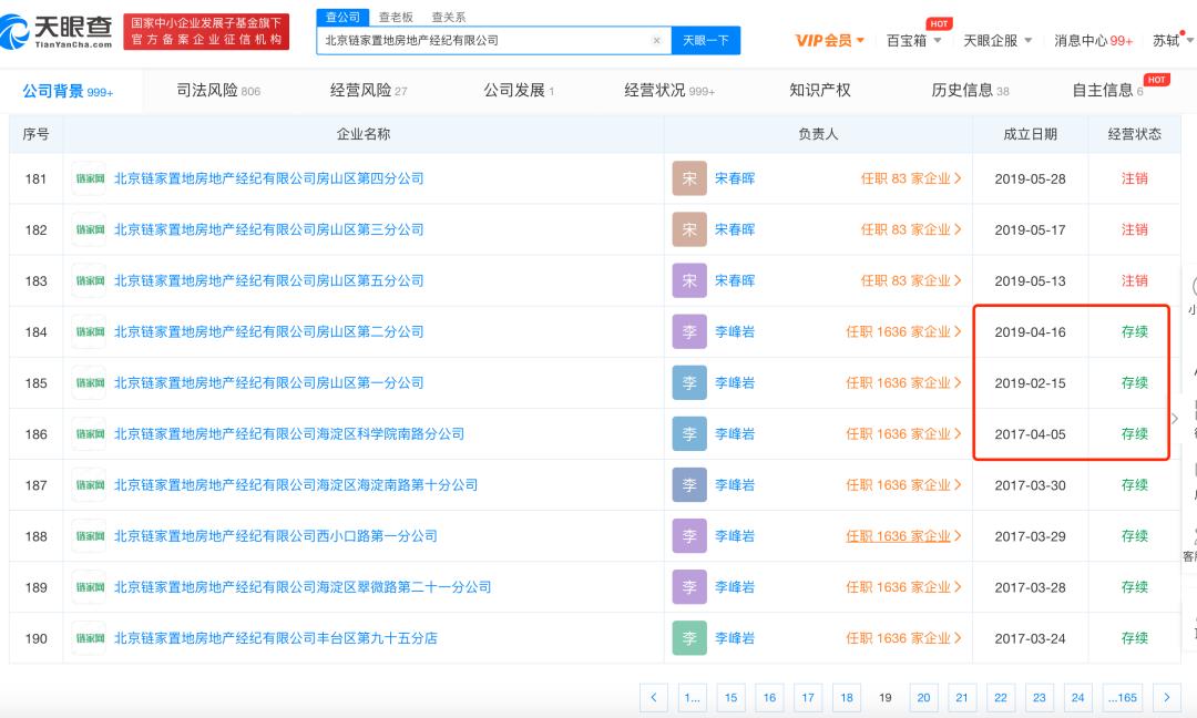 通过天眼查APP查询“北京链家置地房地产经纪公司”分支机构的注册的成立日期也可发现,自2017年4月5日至2019年4月16日,北京链家也没有成立具备房地产经纪行业备案资质的经纪公司。