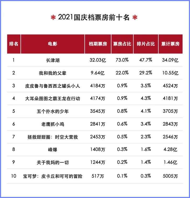 其中,由陈凯歌、徐克、林超贤联合执导的战争史诗巨制《长津湖》势如破竹,不仅以32.03亿的票房领跑整个国庆档,更打破了包括国庆档影片单日票房、国庆档影片总票房、历史战争片总票房在内的24项纪录,占据了整个档期票房的73%,毫无疑问的成为了国庆档的最大赢家;