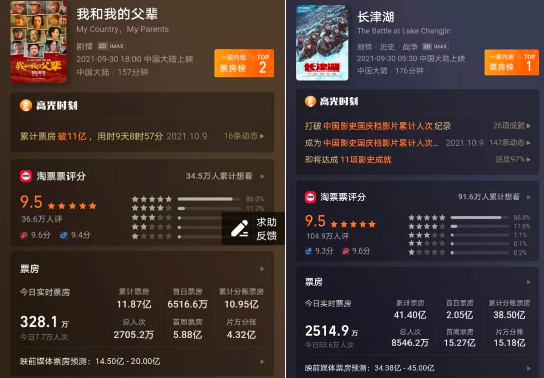 不出所料,刚刚过去的国庆档,中国电影市场迎来“大回春”。根据猫眼专业版数据显示,在《长津湖》和《我和我的父辈》“一超一强”的带动下,今年的国庆档总票房已破50亿,超越去年国庆档的39.67亿元,位居中国影史同档期第二。