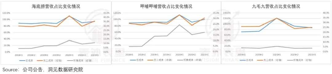 而成本费用方面,如下图,2021H1海底捞、呷哺呷哺的成本占营收比,出现环比上升;九毛九则有所下降。