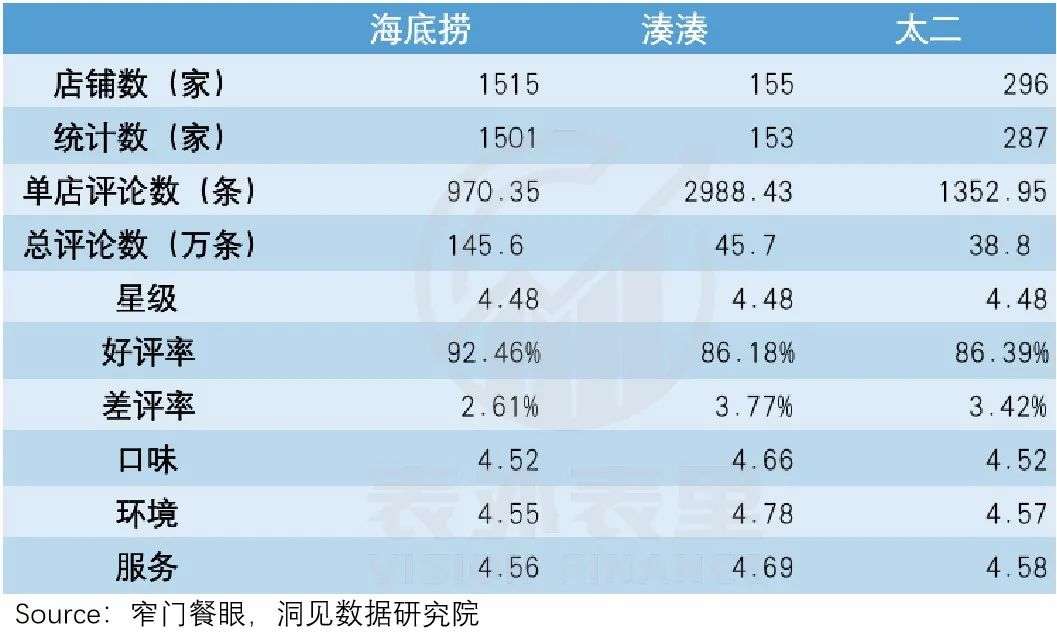 在这一点上,海底捞无疑更具恢复优势。如下图窄门餐眼的数据,海底捞在认可度口碑上,总体的评论数、好评率上远高于呷哺呷哺的湊湊、九毛九的太二。