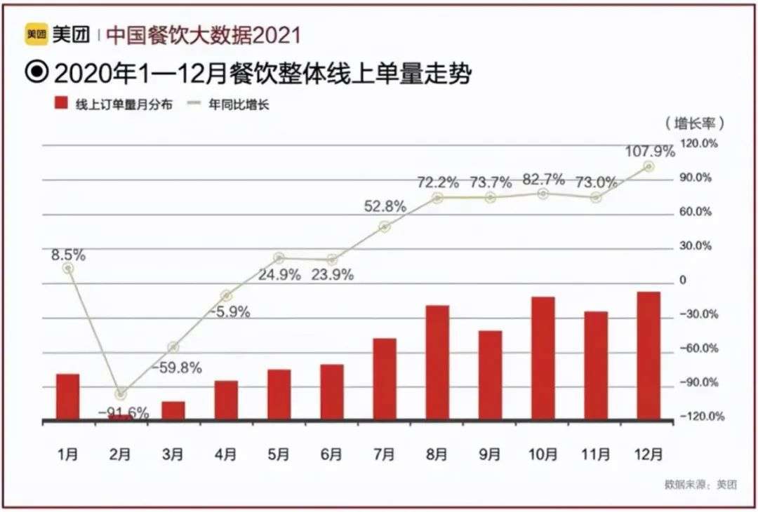 如下图,据美团餐饮大数据2021显示,2020年,线上餐饮整体单量同比增长率持续上升,12月达到107.9%。