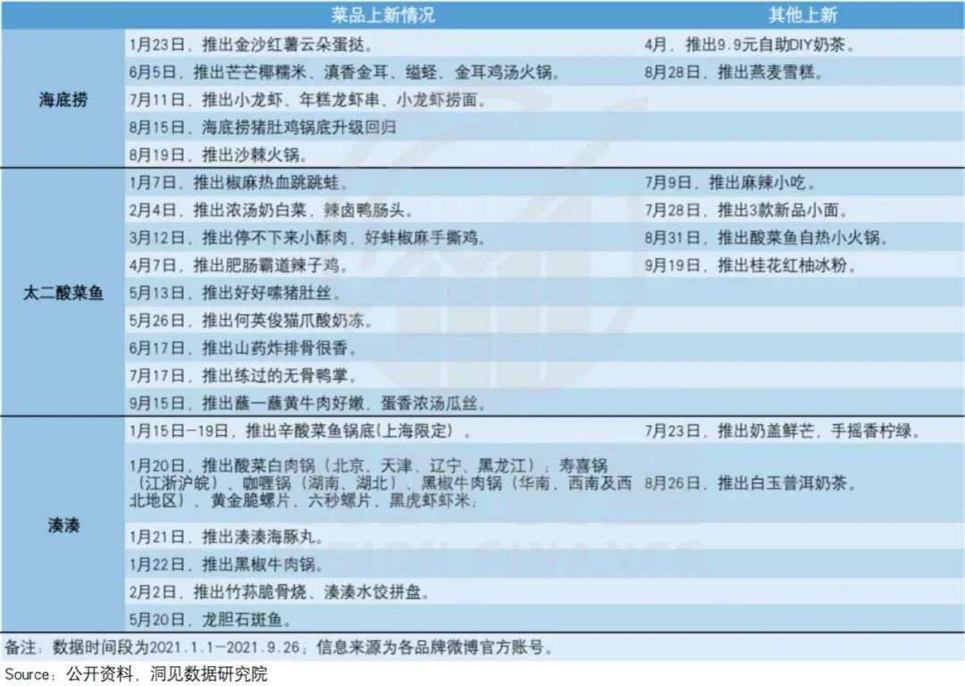 就产品推新方面来说,太二今年以来,几乎每个月都有一款新品推出;海底捞从6月份开始,出新频率也变得密集起来;湊湊的菜品出新多集中在1月份,之后布局力度大减(或受高管层动荡影响)。