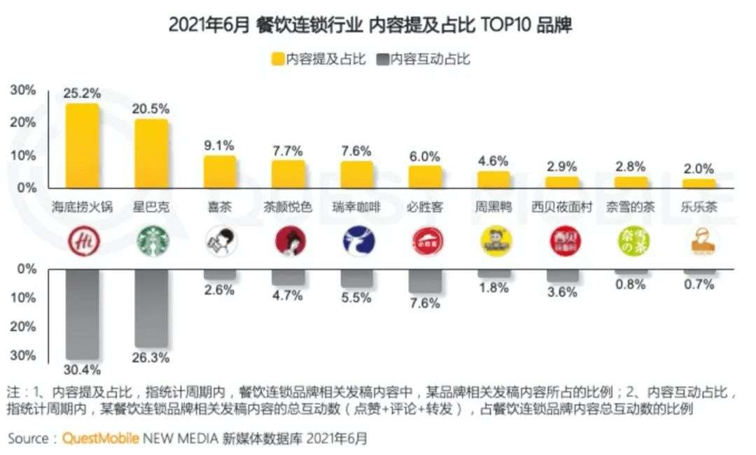 强势运营之下,据QM数据,截至2021年6月,海底捞的内容提及占比和内容互动占比都维持业内最高,超过标杆星巴克。