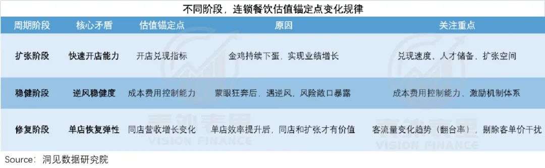 也就是说,市场对餐饮股价值锚定的转变,是由餐饮行业发展中暴露的问题决定的。按照这个逻辑,我们梳理发现疫情后至今,餐饮行业的估值锚定可分为三个阶段(如下图),具体逻辑为: