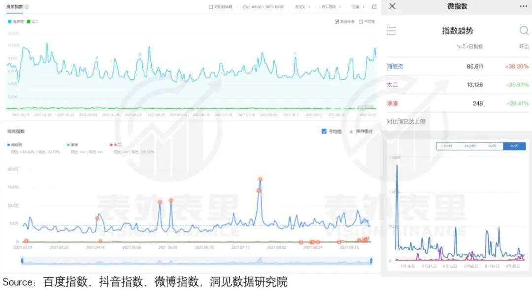 这些表现反应在搜索热度上,即无论是微博指数、百度指数,还是抖音指数上,海底捞都比湊湊、太二高出不少。