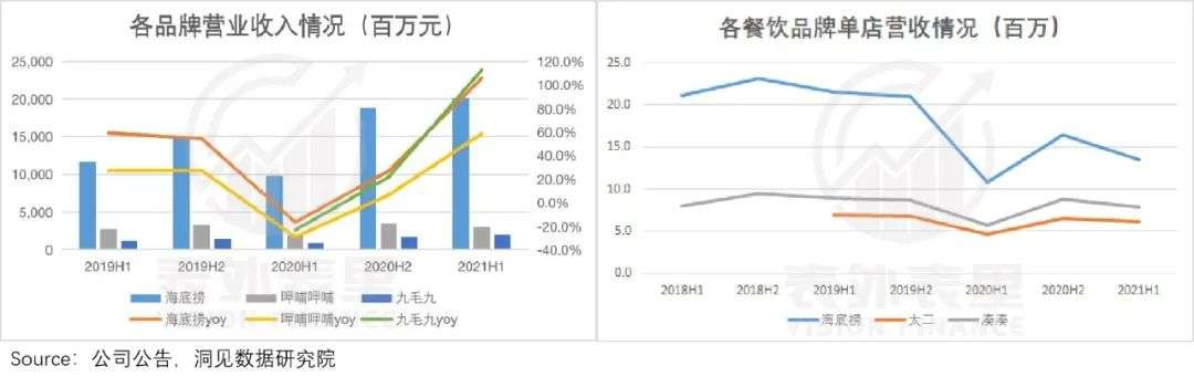 同时,可以看到这一阶段后,疫情影响减少叠加店铺扩张,带动各家企业的营收状况向好。如下图,2021H1海底捞、呷哺呷哺、九毛九的营收绝对值,都已超过2019年的同期水平。