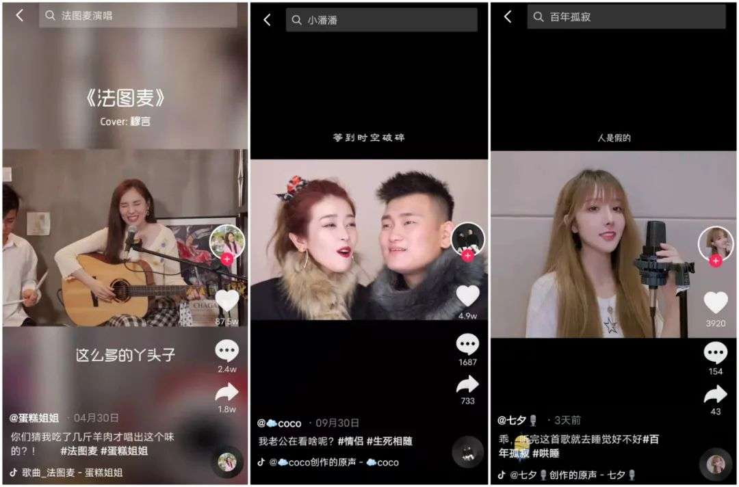 歌曲迭代如此之快,以至于从投入产出比来看,翻唱比原创更加高效。在平台的游戏规则之下,许多歌手在具有一定的知名度之后,为锁定流量,便会紧跟流行进行翻唱。如前文中提到的叶泽浩、小潘潘,他们的抖音首页中大量充斥着翻唱作品,从颇具国民度的《女人是老虎》、《美丽的神话》到其他抖音热歌,均在他们的翻唱之列。