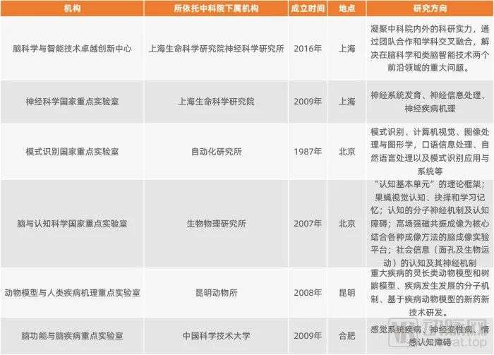 除此以外,作为国内脑科学研究的中坚力量,中科院下属各机构在脑科学上也有着突出的表现。目前,中科院的脑科学研究机构主要包括脑科学与智能技术卓越创新中心、神经科学国家重点实验室、模式识别国家重点实验室、脑与认知科学国家重点实验室、动物模型与人类疾病机理重点实验室、脑功能与脑疾病重点实验室。