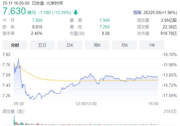 10月11日,联想集团股价大跌,盘中最大跌幅一度接近18%。截至收盘,联想集团股价跌13.39%至7.63港元,总市值918.78亿港元,市值蒸发约140亿港元。