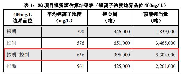 其中,探明+控制级碳酸锂当量资源量为530.4万吨,平均锂离子浓度为636mg/L。