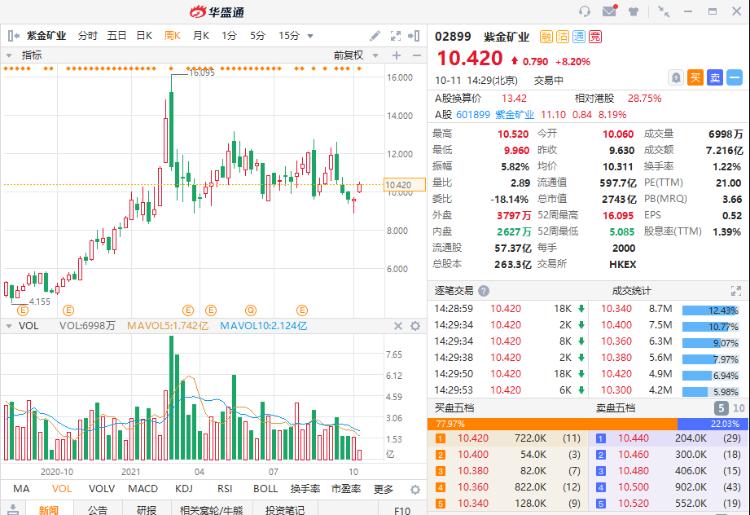 截至2021年10月11日盘中,紫金矿业AH股一度大涨超8%,此前从2020年8月至2021年2月紫金矿业港股走出过一波从4.15港元持续上涨至16港元的行情,累计涨幅超过285%。