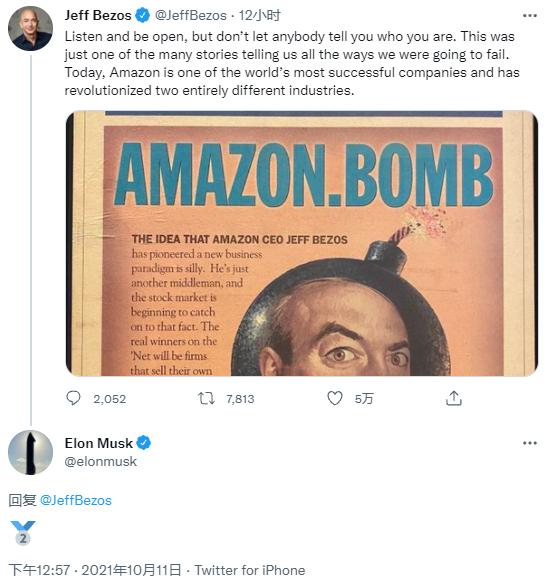 马斯克发出的这个“第二”的表情符,实际上回应了贝索斯在周日的推文。推文中,贝索斯谈到了一些在亚马逊早期阶段对公司发展存在怀疑的人。