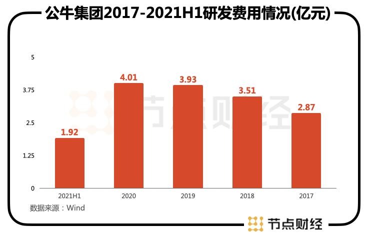 最直接的表现就是研发。2017—2021年H1,公牛集团研发费用投入分别为2.87亿元、3.51亿元、3.93亿元、4.01亿元、1.92亿元,营收占比不高。