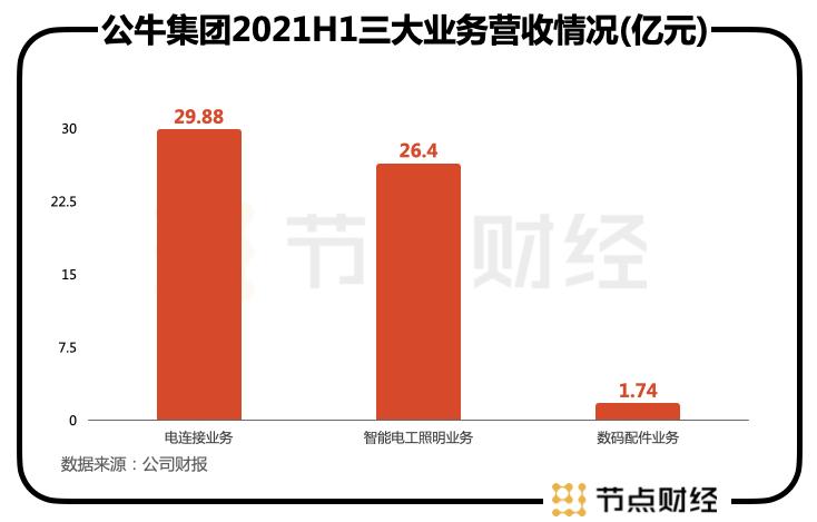 从插座起家,直到3年后的2008年,公牛才开始进军壁灯开关业务。此后杀入基础照明灯领域,可以说,公牛走的是稳扎稳打的风格。目前,公牛集团主要有三大业务板块,分别是“电连接业务”、“智能电工照明业务”及“数码配件业务”,在今年上半年分别实现营收29.88亿元、26.40亿元和1.74亿元。