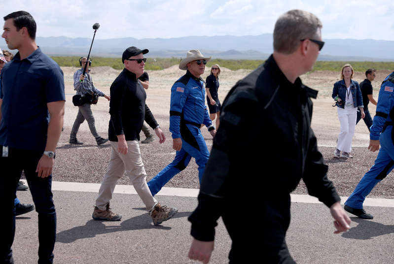 蓝色起源首席执行官鲍勃·史密斯戴着黑色帽子与创始人杰夫·贝索斯(中)散步,此前该公司于7月在得克萨斯州西部港口完成了首次载人航天任务,贝索斯参加了首飞