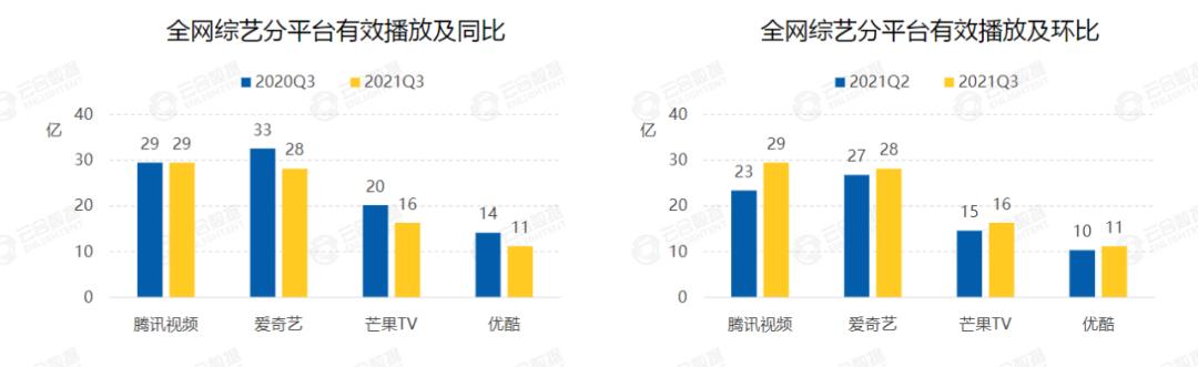 从平台战况来看,第三季度的综艺市场格局并无较大变化:云合数据显示,Q3腾讯视频和爱奇艺的有效播放分别为29亿和28亿,相差不多,处于第一梯队,芒果TV(16亿)和优酷(11亿)稍逊一筹。