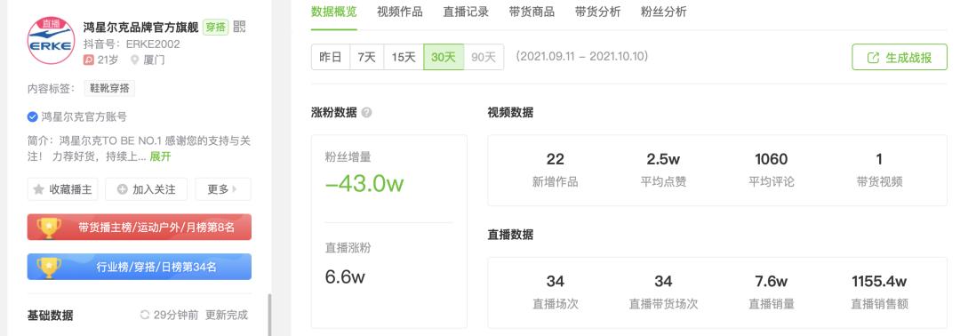 截至10月11日,据飞瓜数据,近30天以来,鸿星尔克品牌官方抖音直播间“直播涨粉”6.6万,但同期内“掉粉”43万。与此同时,近一周内,直播间累计9场直播的销售额不到300万元。