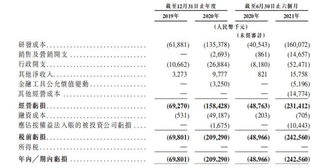 没有营收,微创医疗机器人的财务报表自然不好看。最新财报显示,公司2019年、2020年的亏损为6,980.1万元、2.09亿元。2021年上半年亏损约2.42亿元,较2020年上半年的4,896.6万元扩大3.95倍。也就是说,两年半加起来亏损超5亿元。