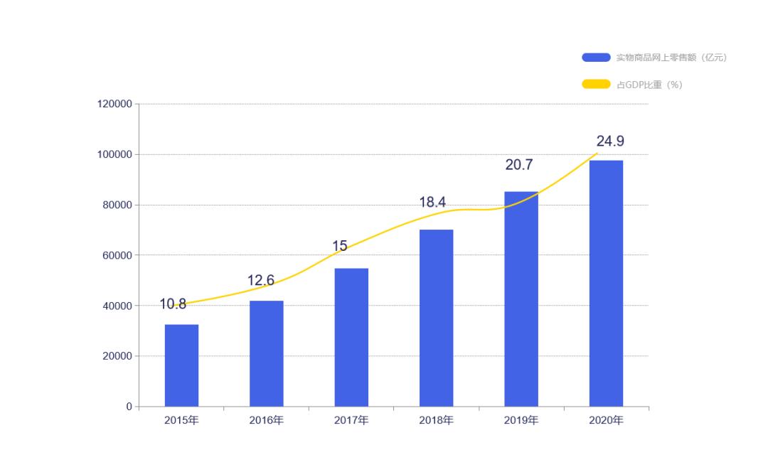 突如其来的疫情,很大程度上改变了消费格局,促使更多消费者接受并习惯线上零售。我们可以看到,即使是在2020年,我国网上零售额占GDP的比重也小幅提升。