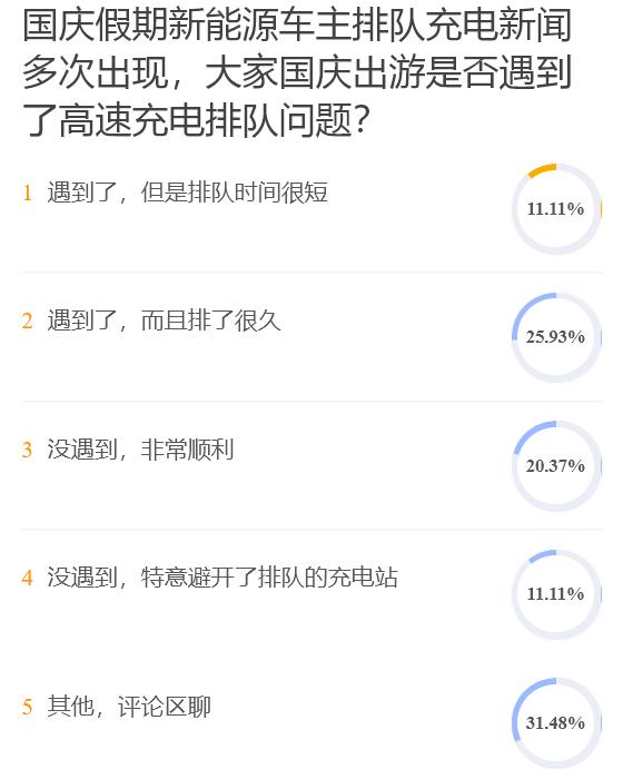 以电动车用户为主的网站电动邦国庆后做了一项调查,近百位在长假开电动车出行的用户中,选择排队很久和非常顺利的占比只相差5个百分点,选择遇到排队问题和没遇到问题的用户也几乎相同。这些来自电动车主的声音比社交媒体上的吐槽更能反应真实情况。