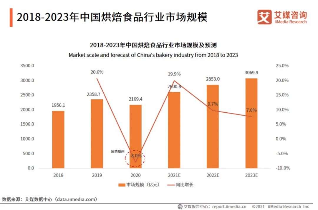 据艾媒咨询数据显示,2021年中国烘焙食品行业市场规模将达2600.8亿元,同比增长19.9%。推测,2023年中国烘焙市场规模预计达到3069.9亿元。