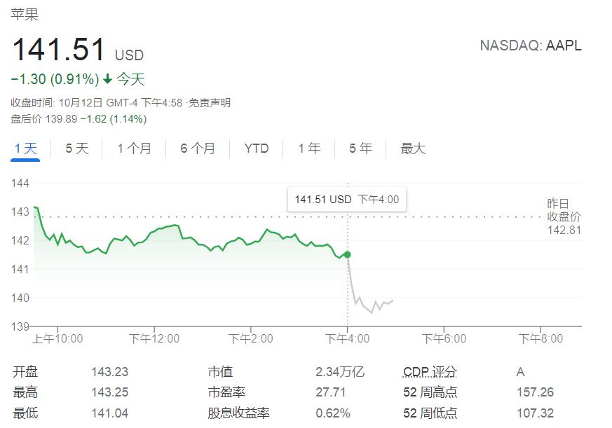 截止美东时间10月12日,苹果收于141.51美元,收跌0.91%,受此消息影响,苹果股价盘后跌幅超1%。