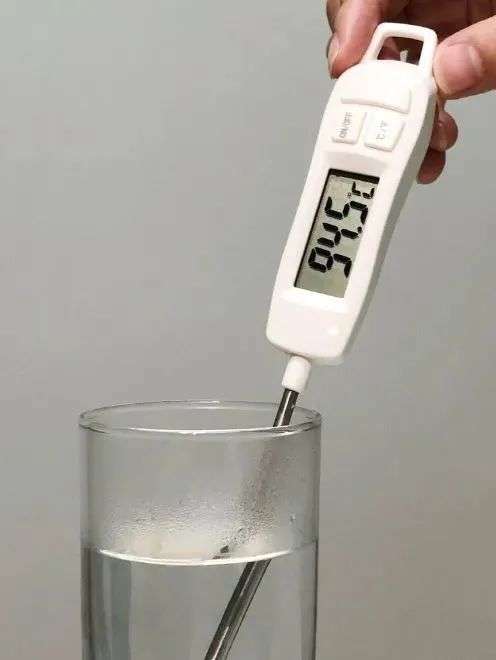 刚烧的开水倒进杯子里,温度是 94 ℃ 左右,放置了约 15 分钟,才降到 65 ℃ 。
