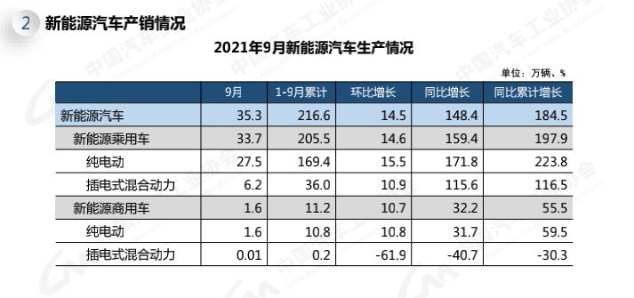 中汽协数据显示,9月,新能源汽车产销分别达到35.3万辆和35.7万辆,环比增长14.5%和11.4%,同比增长均为1.5倍。从1-9月数据来看,新能源汽车产销分别达到216.6万辆和215.7万辆,同比增长1.8倍和1.9倍。