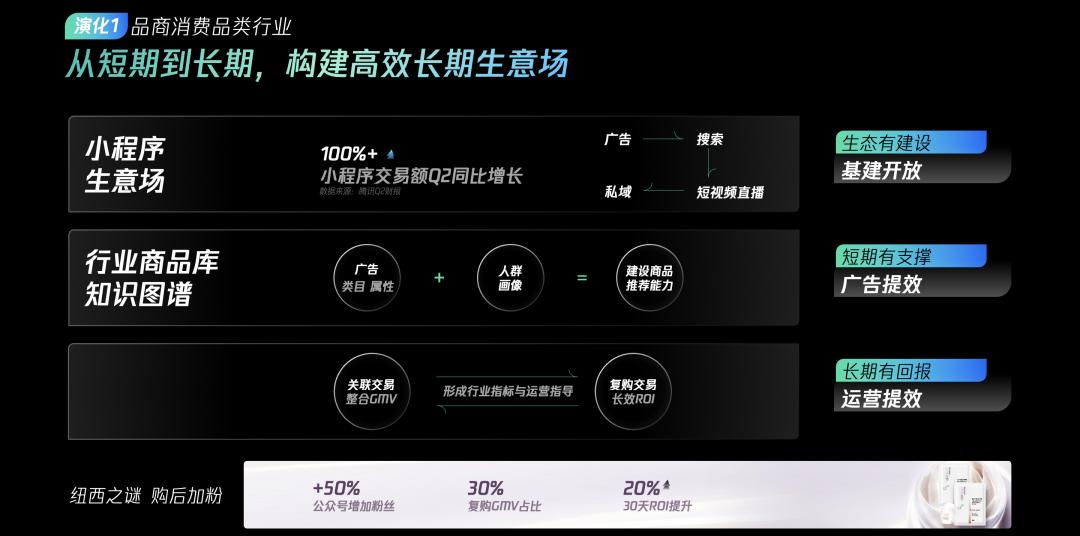 例如对于消费品企业来说,首先通过小程序的基建能力,搭配广告、搜索、直播等工具,能够将公域流量通过私域体系来承接运营;其次再利用腾讯广告系统的数据标签能力进行用户的深度分析及商品关联匹配;最后通过多样化的运营工具结合数据看板不断优化转化及复购。在这三项基本操作后,纽西之谜仅仅在购买后添加了一个加粉的按钮,便迅速实现了公众号涨粉增加50%、复购GMV占比30%、30天ROI提升超20%。