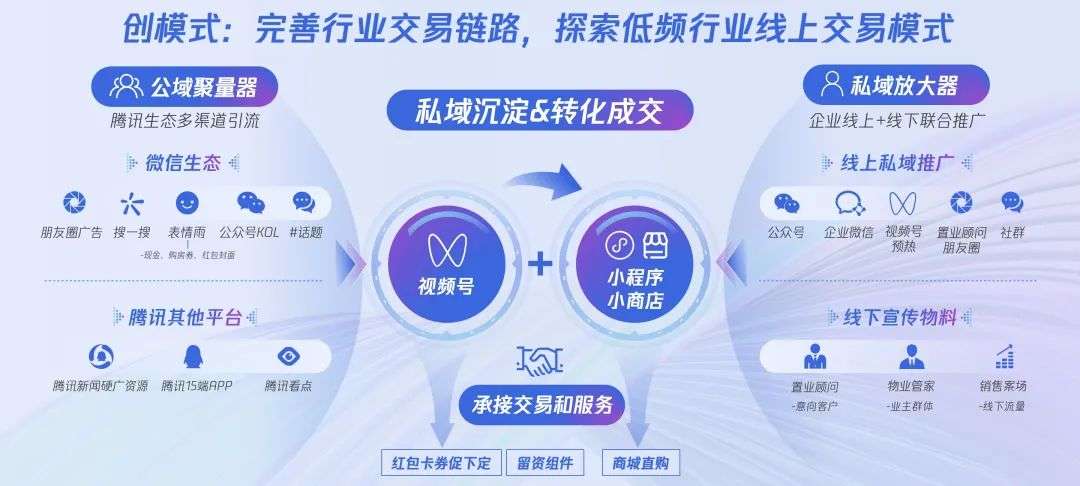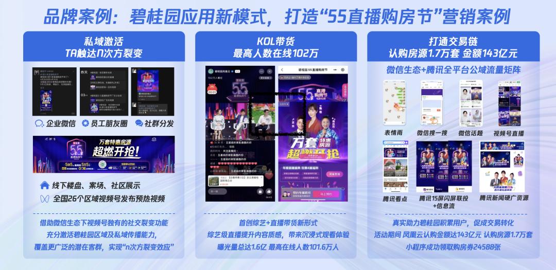 而对于地产、汽车这类长周期决策的行业来说,用户消费决策心理过程需要更细颗粒度的划分,企业销售也需要承担更多顾问角色,品牌对用户长线的跟进互动必不可少。例如碧桂园通过腾讯生态公私域结合的全域增长手段,借助一场55直播购房节,便实现了当场认购房源1.7万套,认购总价约143亿,实现了爆发式的增长。