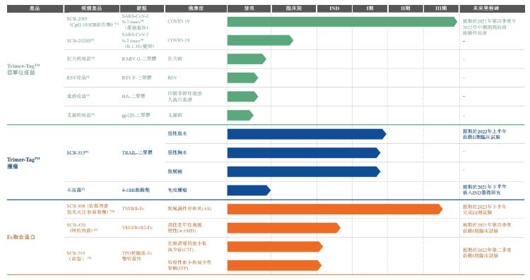 基于Trimer-Tag技术平台,三叶草生物建立了14条管线,包括6种Trimer-Tag亚单位疫苗、两种Trimer-Tag肿瘤候选药物和3种Fc融合候选产品。