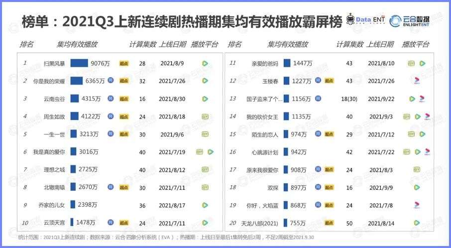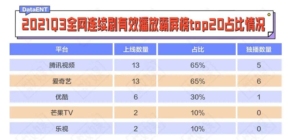 从Q3上新剧的集均有效播放来看,前二十名里一共有13部在腾讯视频播出,前十名中腾讯视频的独播剧集占到了一半。