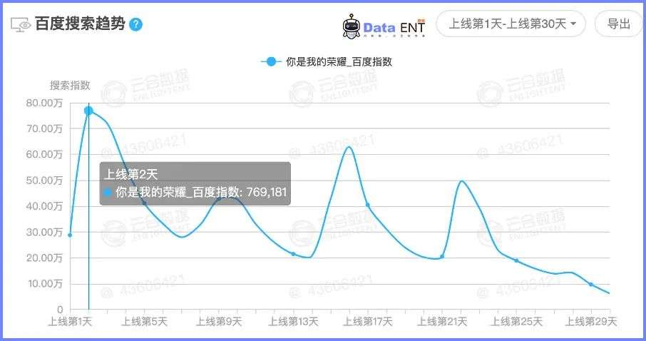 头部剧集一骑绝尘的不只是播放成绩,还有讨论度,《你是我的荣耀》上线第二天,百度指数就飙升至76万+。