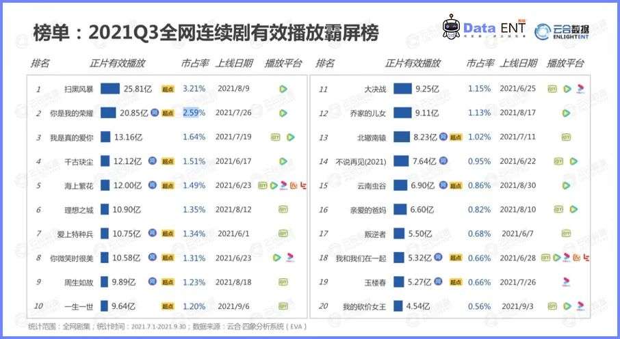 暑期档的最大赢家无疑是《扫黑风暴》,这部集结了孙红雷、刘奕君和吴越等多位实力演员的主旋律剧,以正片有效播放25.81亿、市场占有率3.21%领跑2021Q3剧集市场,《你是我的荣耀》紧随其后,也以突破20亿的正片有效播放和2.59%的市场占有率与排名后面的剧集拉开了不小的差距,两部剧的会员内容有效播放量均超过了10亿。
