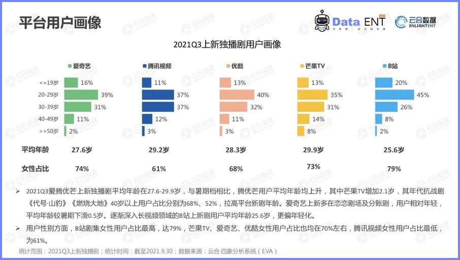 这种全面开花的剧集布局策略对扩大用户覆盖面和核心用户规模的效果也很明显。云合数据的报告显示,各平台的2021Q3上新独播剧用户画像中,腾讯视频的性别比例最为平衡,年龄层次也最集中在20代和30代用户上,占比达到了74%。