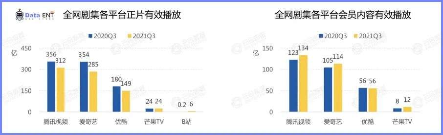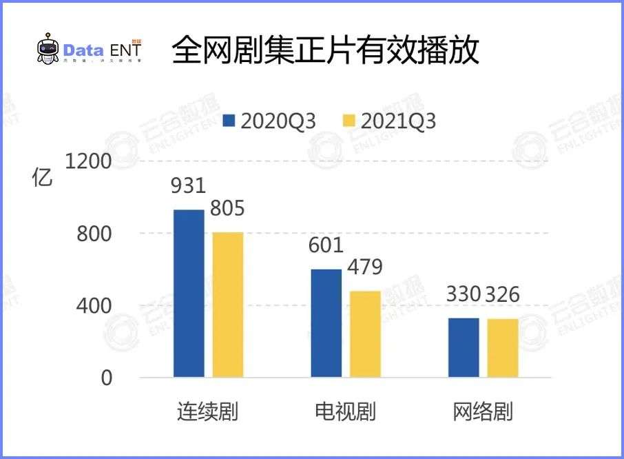 不久前,云合数据发布了2021Q3连续剧网播表现及用户分析报告。2021Q3全网剧集正片有效播放量共805亿,虽然环比2021Q2上涨了11%,但同比2020Q3却下滑了14%,各个平台的剧集正片有效播放量也较去年有不同程度的削减。