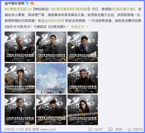 扫黑除恶题材的《扫黑风暴》也是对扫黑除恶工作者的一次有力宣传。剧中正义阵营与邪恶势力的较量让观众深刻地感受到了公安扫黑除恶、捍卫法治正义的魄力与艰辛;而在戏外,剧方还联合百家党政官博发起了致敬扫黑英雄的活动,主演的宣传也带动了更多观众与粉丝自发地参与进来。