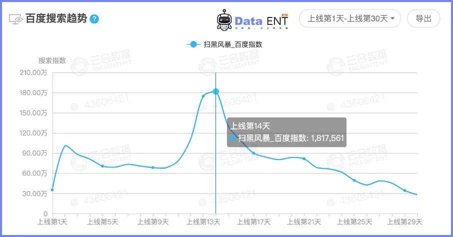 而《扫黑风暴》更是全网爆火,不但拿下279个热搜,播出期间百度指数也居高不下,基本维持在60万以上,在上线第14天更是突破180万。