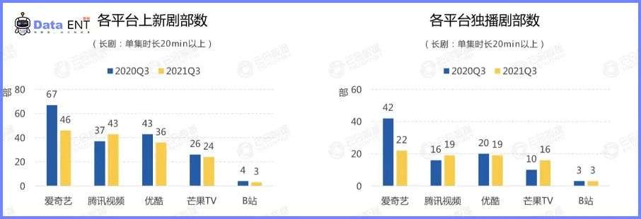 丰富的剧集储备量是内容布局的基础,据云合数据,2021Q3腾讯视频连续剧上新量为43部,较去年增加了6部,其中独播剧上新数量为19部,比去年增加了3部,均居各平台前列。