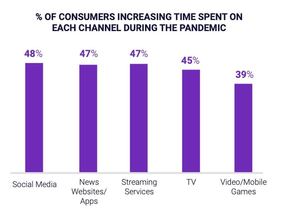 疫情期间,人们在社交媒体、新闻网站、流媒体服务、电视节目和电子游戏等方面所耗费的时间依次上涨了48%,47%,47%,45%,以及39%。图片来源:DOUBLEVERIFY
