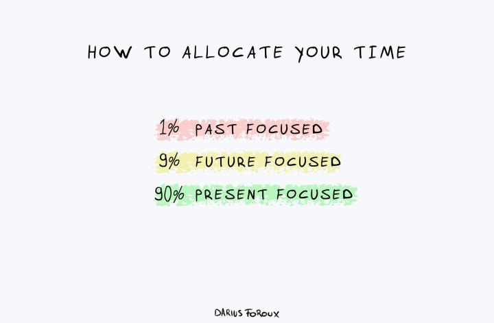 这个比例,我只是牢记在心,我并没有详细追踪了解每天24小时是否严格按照这一比例来生活。日常生活中,我更多的是把这一原则当作一项准则。如果我发现一天之内多次回顾过去,我就会提醒自己这是徒劳的。